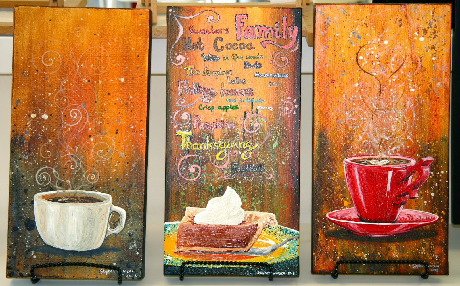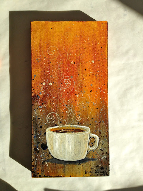 I just finished this painting! Its dimensions are 8" x 16" (x 2" deep) acrylic on canvas. I will be adding it to our line of options at the studio for private painting events and paint and pour events. I worked at Starbucks for 5 years from 2008 - 2013, so I know all about the need for a good cup of coffee. Furthermore, I know how many of you out there know about that too! :)