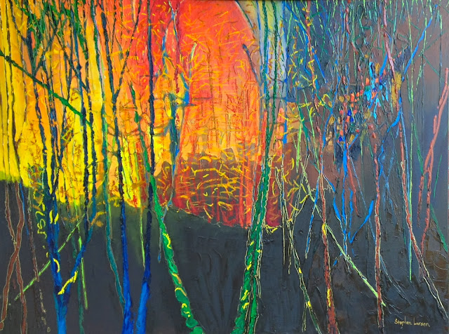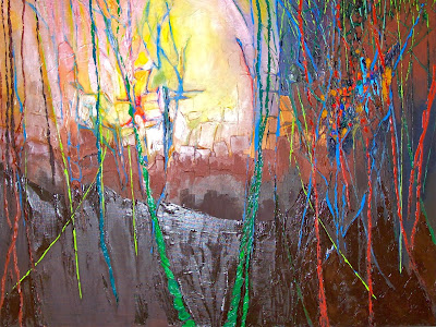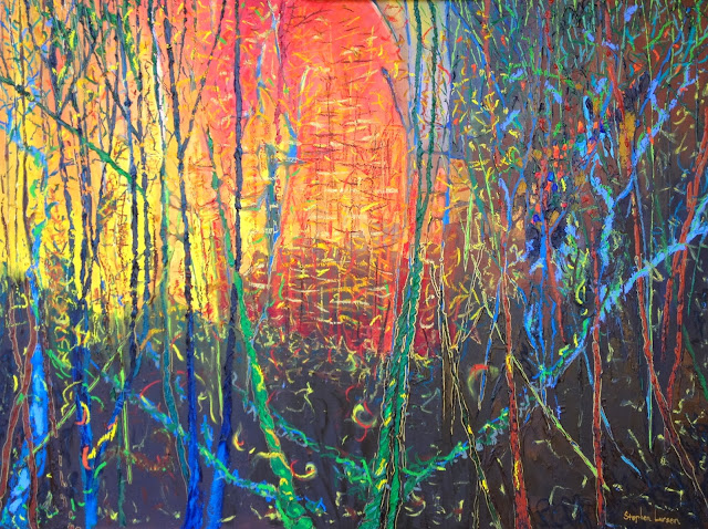 I work at Donna Downey Studios and in the studio we have 2 large books on Wolf Kahn's pastel paintings. Since I see these regularly, his high energy, textural, mark making was on my mind. I started with the warm area of the painting feverishly swiping the pastel across the surface. The painting has so much thick texture already that is made it hard to produce any long lines.