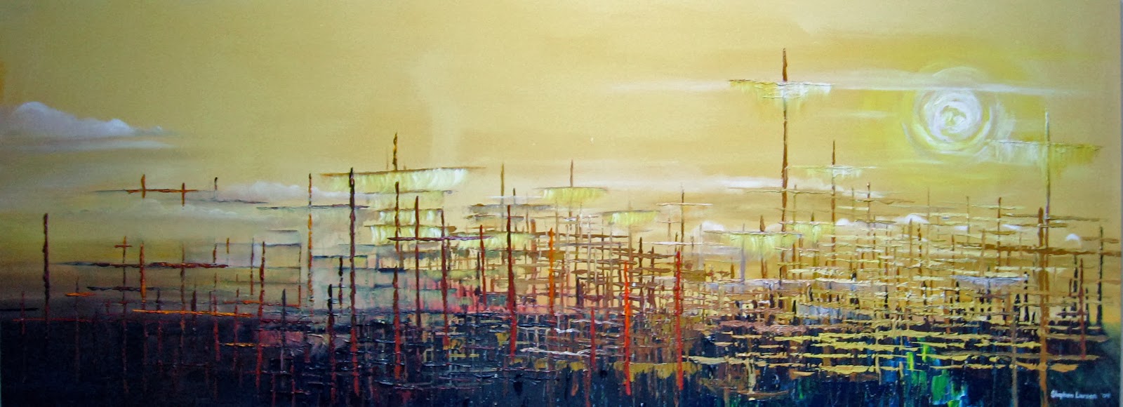 The downward motion of the fog rolling in from the left on the new painting might be a bit sharp. I'll consider repainting the lower left quarter to keep from sending the eye off the painting. The old Shipyard painting (as seen at the bottom of this post) has strictly horizontal movement on the left quarter. I remember the left side being the most difficult 4 & 1/2 years ago when I painted it over and over again seeking satisfaction.