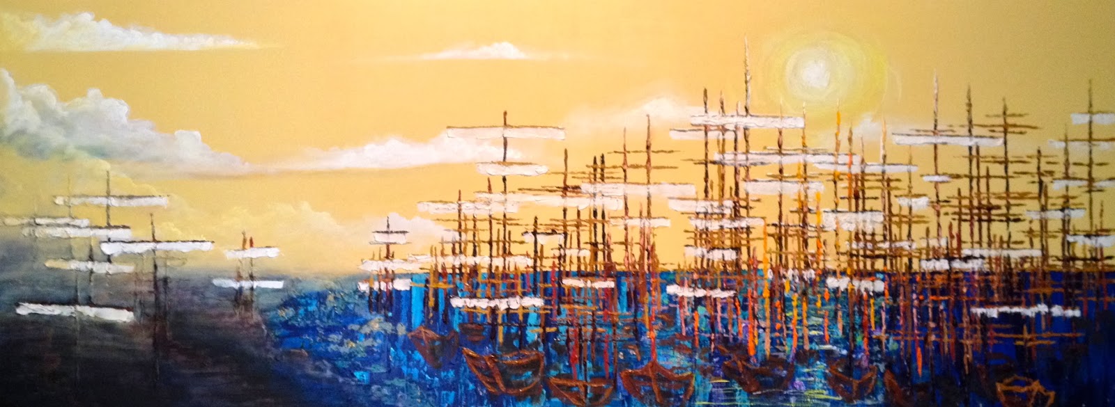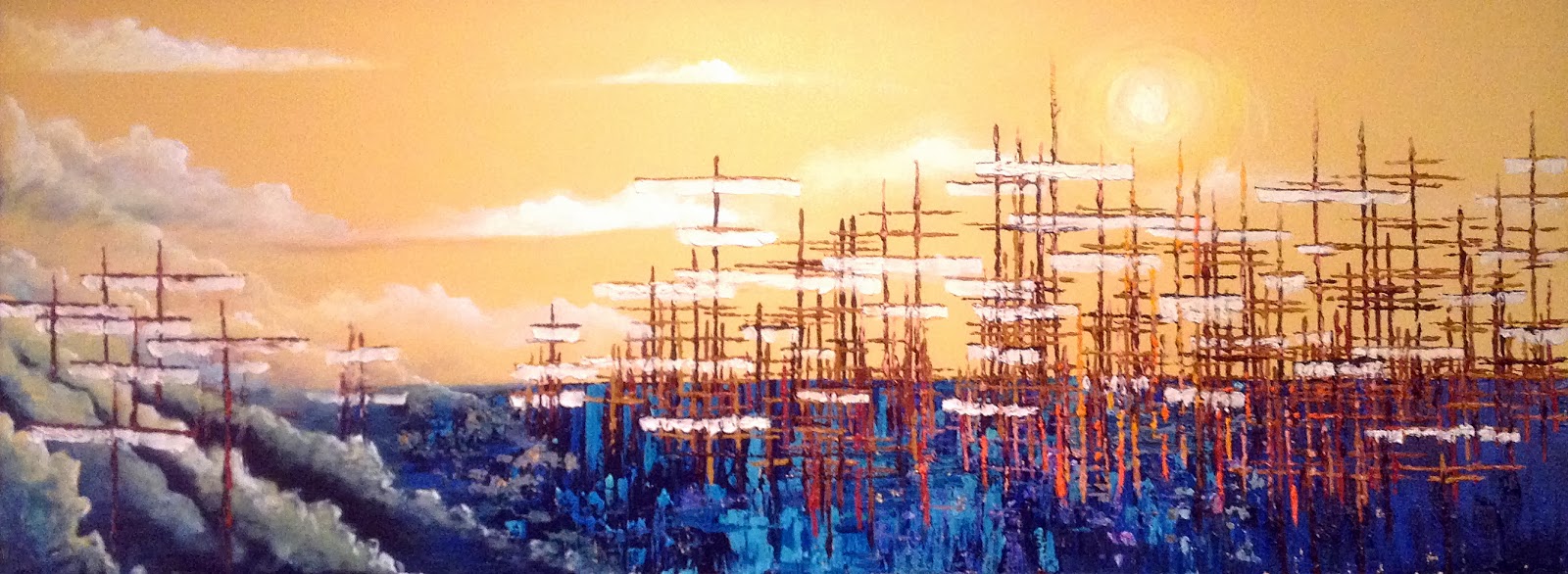 At this step below, I added the abstract ships beneath the masts. I also continued reducing the diagonal fog in the bottom left corner.