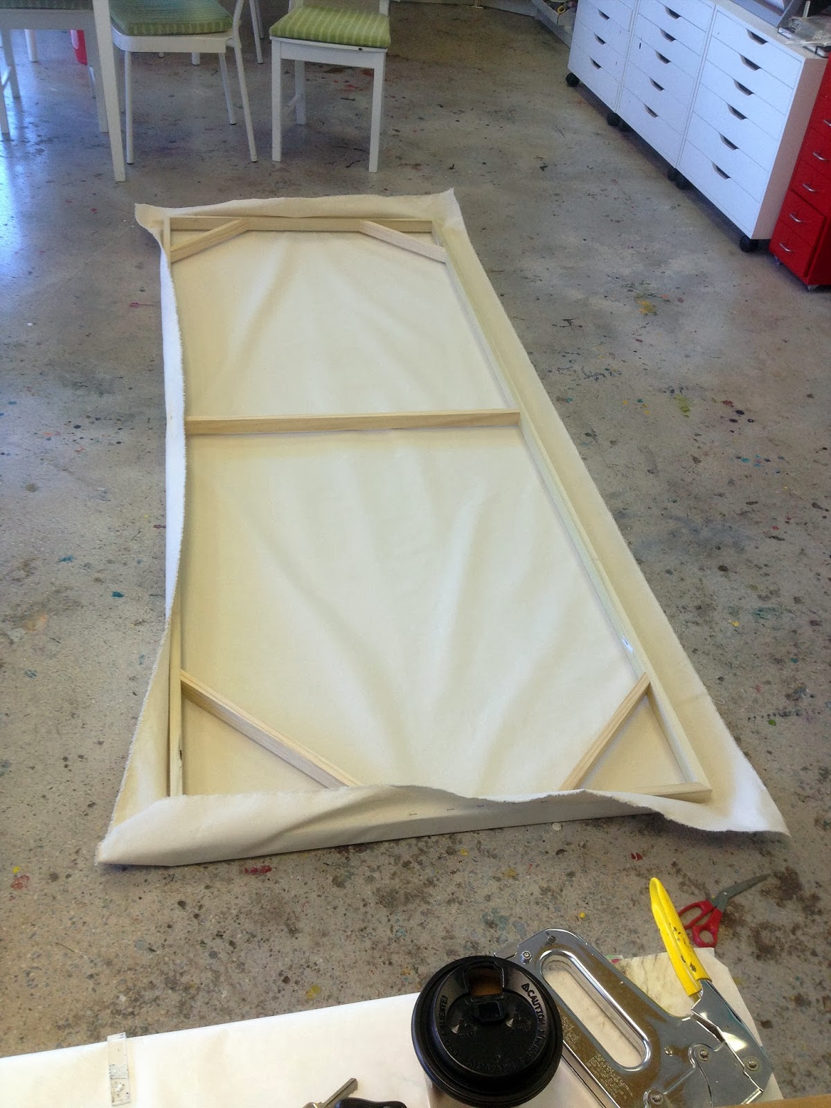 Step 2: Once construction was complete, it was time to stretch the canvas. I used a heavy duty staple gun and 1/2" staples from the hardware store. It is important to stretch the canvas in a star pattern working your way from the middle of each side out to the corners. It is also important to stretch the canvas somewhat loosely to keep the canvas from warping your frame when you prime it. The cotton shrinks dramatically during the priming process.