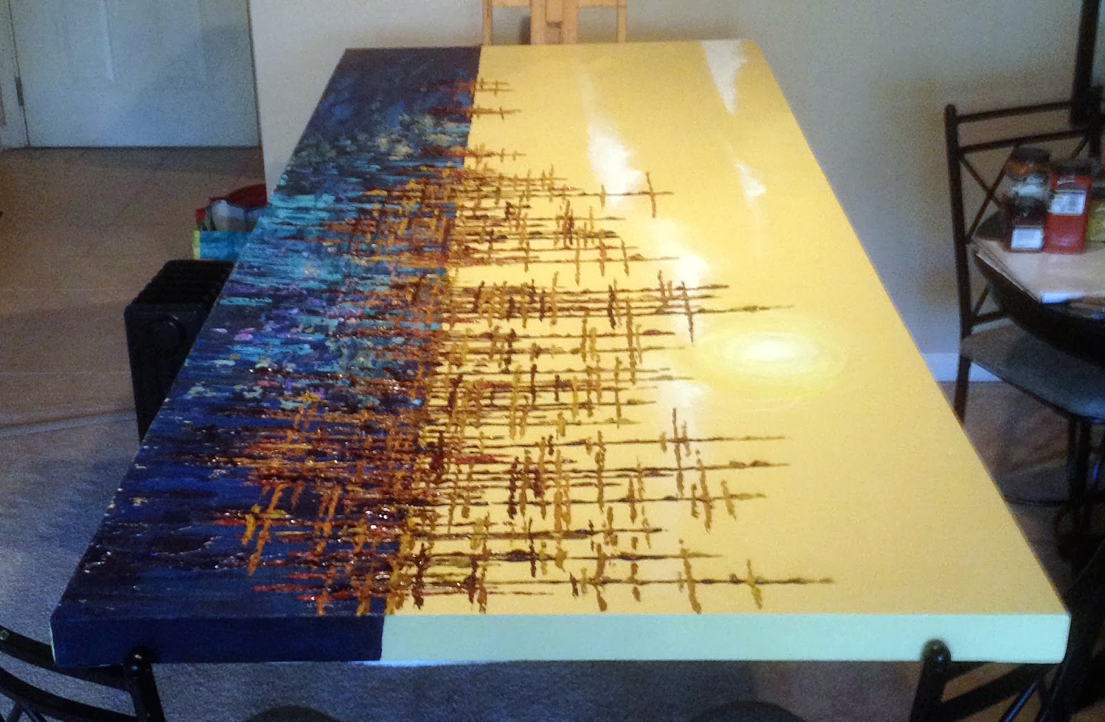Step 6: Paint! Since the sky color is already in, the next thing to paint was the water. Using a palette knife and very heavy body paints, I began working my way from the horizon line down to the edge of the canvas.