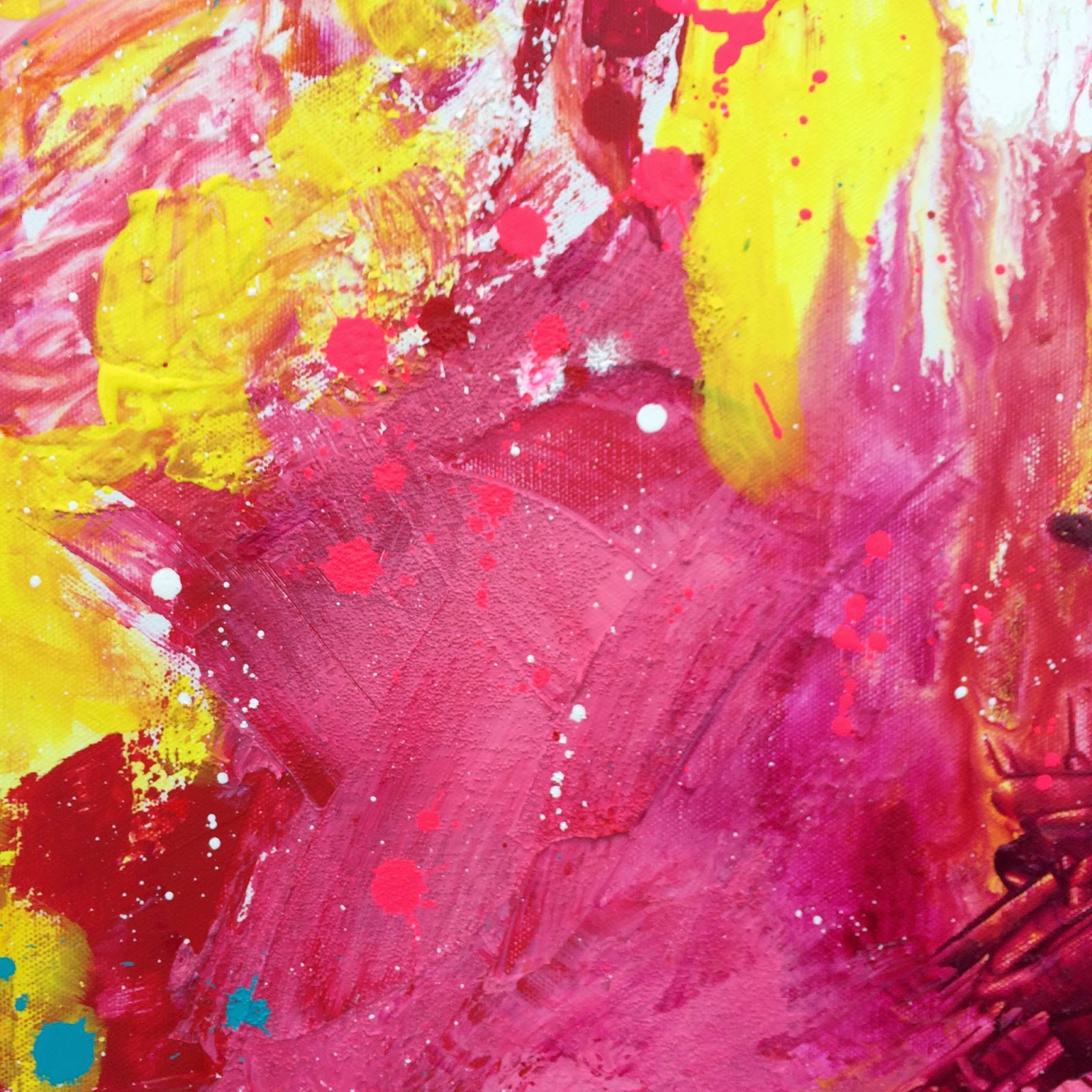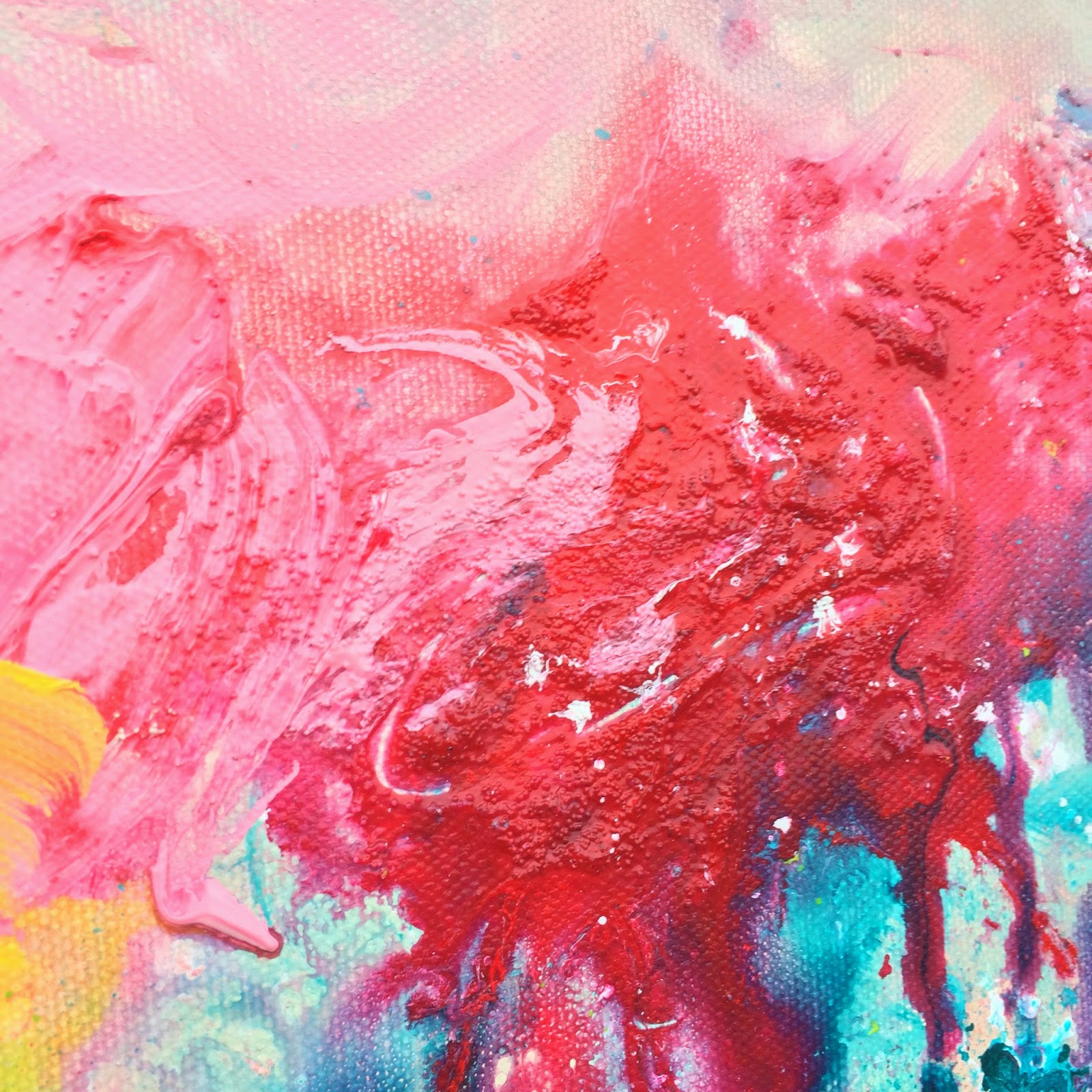 This is the 36"x 36" painting that my wife Cara and I worked on together immediately following the Galaxy Splash Abstract painting. This is also an acrylic painting, but has no gold leaf. Sometimes... rarely, I edit back the labor in a painting and this is probably the simplest painting I have ever worked on of this size. Part of the motivation of editing back was because I was working on this painting with Cara who has simpler and more colorful taste than I do. I do enjoy collaborating on paintings with others because you always create artwork that neither would have done on their own. As you can see, we rotated the canvas and dripped the paint in opposing directions to free us up to be able to determine which orientation we wanted most. If your drips are only in one direction, that implies gravity and causes most viewers to assume that the drips fall down and if you rotate the canvas in any other direction it may seam wrong. To combat that thinking, we dripped in different directions. We used glass bead medium, white flake medium, and multiple fluid mediums to increase splatter ability of paints. We finger painted the majority of the left side to create energy without showing obvious brush strokes.