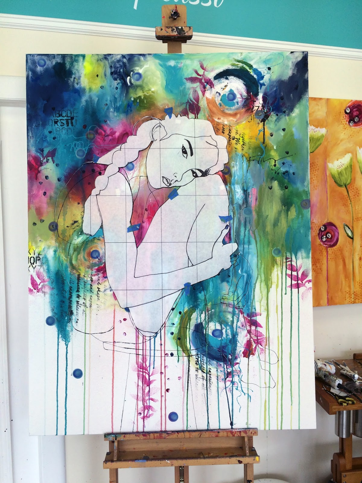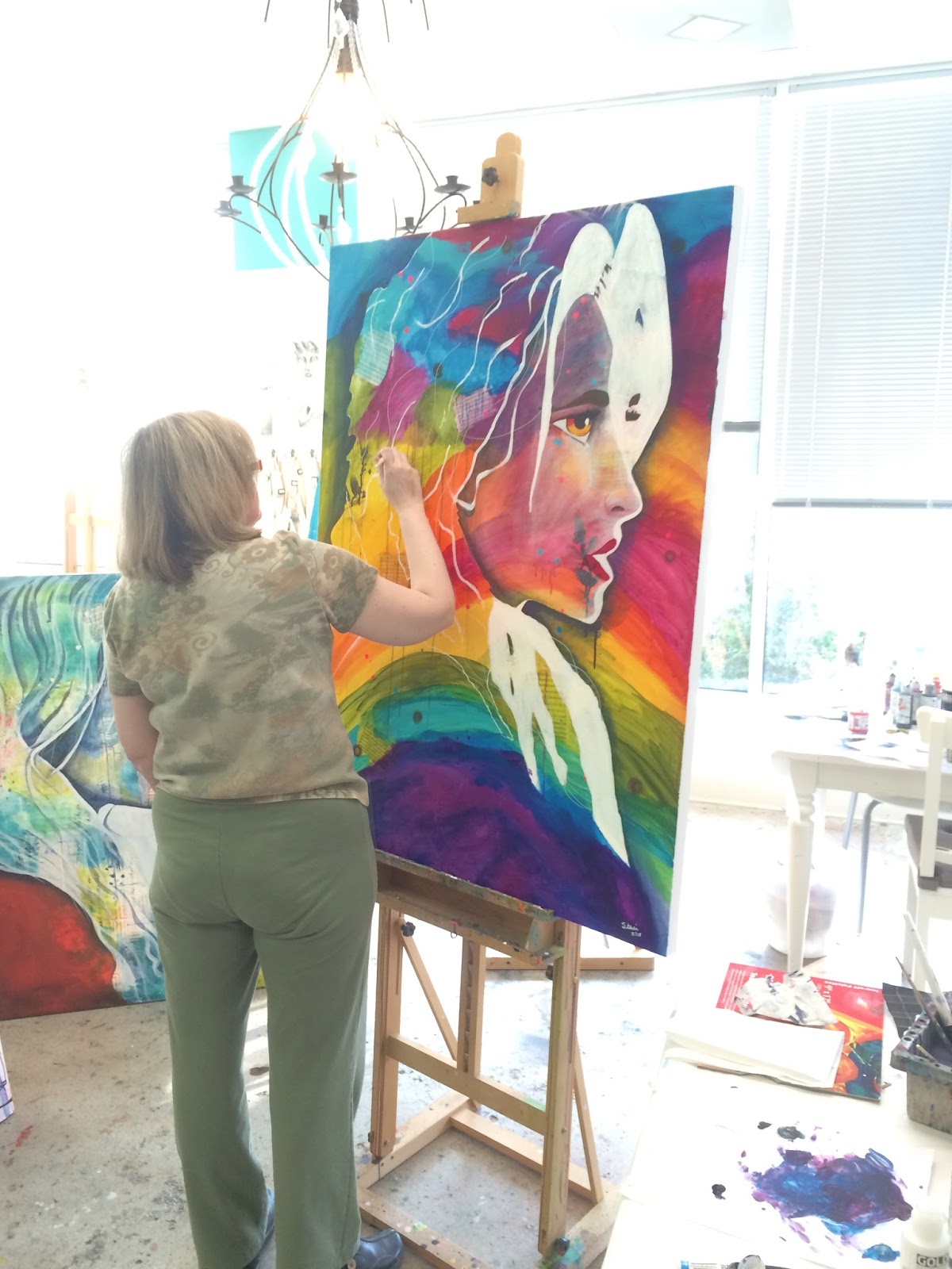In May of 2015, Donna Downey and I taught a workshop at Donna Downey Studios in Huntersville, NC. The paintings were broken down into 2 main segments. First, Donna taught how to create a beautifully colorful background with layers of texture and imagery. Once she had completed her part I took over and taught how to draw a figure using the grid method and then proceeded to teach how to paint in with flesh tones and hair, etc. The end paintings that were produced were all spectacular and uniquely their own!